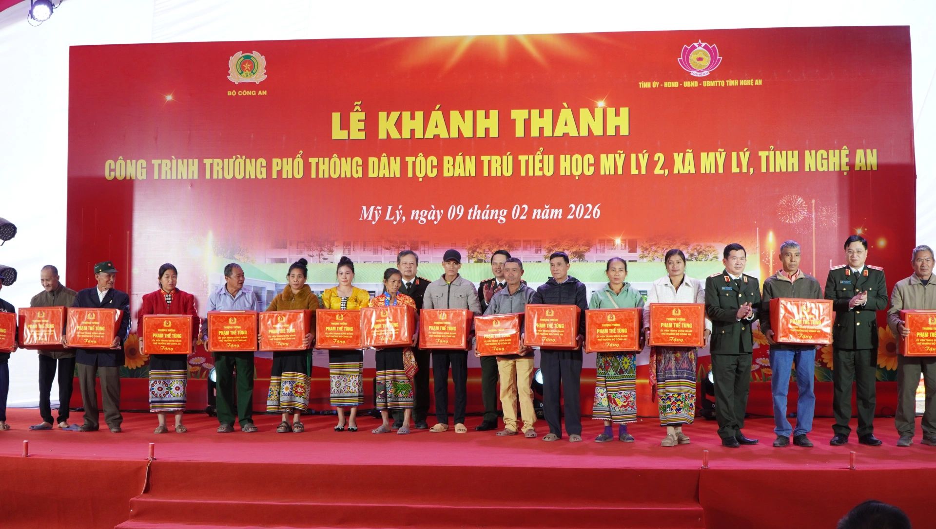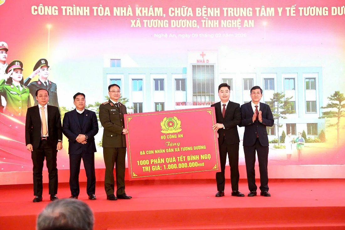 Tại xã Tương Dương, Bộ Công an và Hiệp hội An ninh mạng quốc gia đã trao tặng nhiều phần quà ý nghĩa, gồm: 1.000 suất quà của Bộ Công an dành cho đồng bào các dân tộc; 10 suất quà của Bộ trưởng Bộ Công an tặng các tập thể có thành tích xuất sắc trong xây dựng công trình y tế; 20 suất quà của Thứ trưởng Bộ Công an tặng các hộ gia đình chính sách; cùng các phần quà dành cho Công an xã và UBND xã Tương Dương nhân dịp Tết Nguyên đán 2026.
