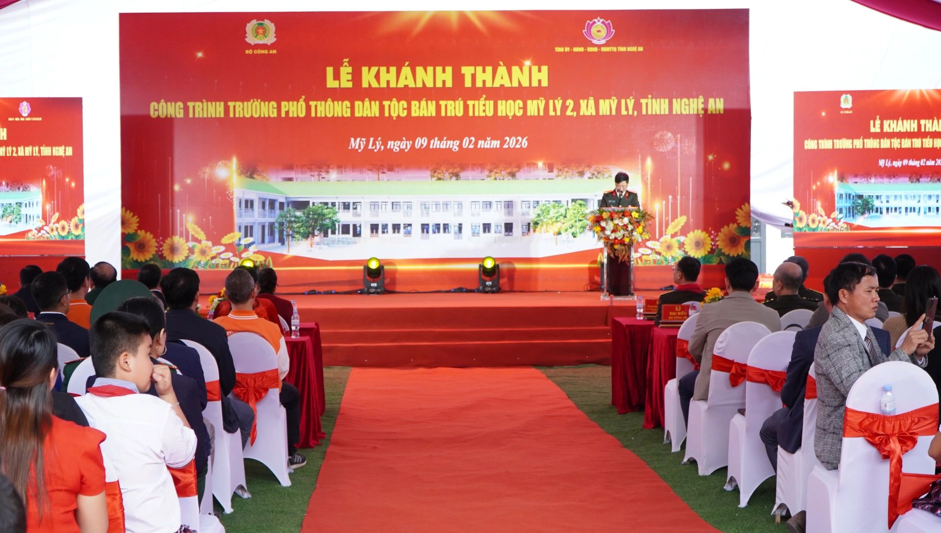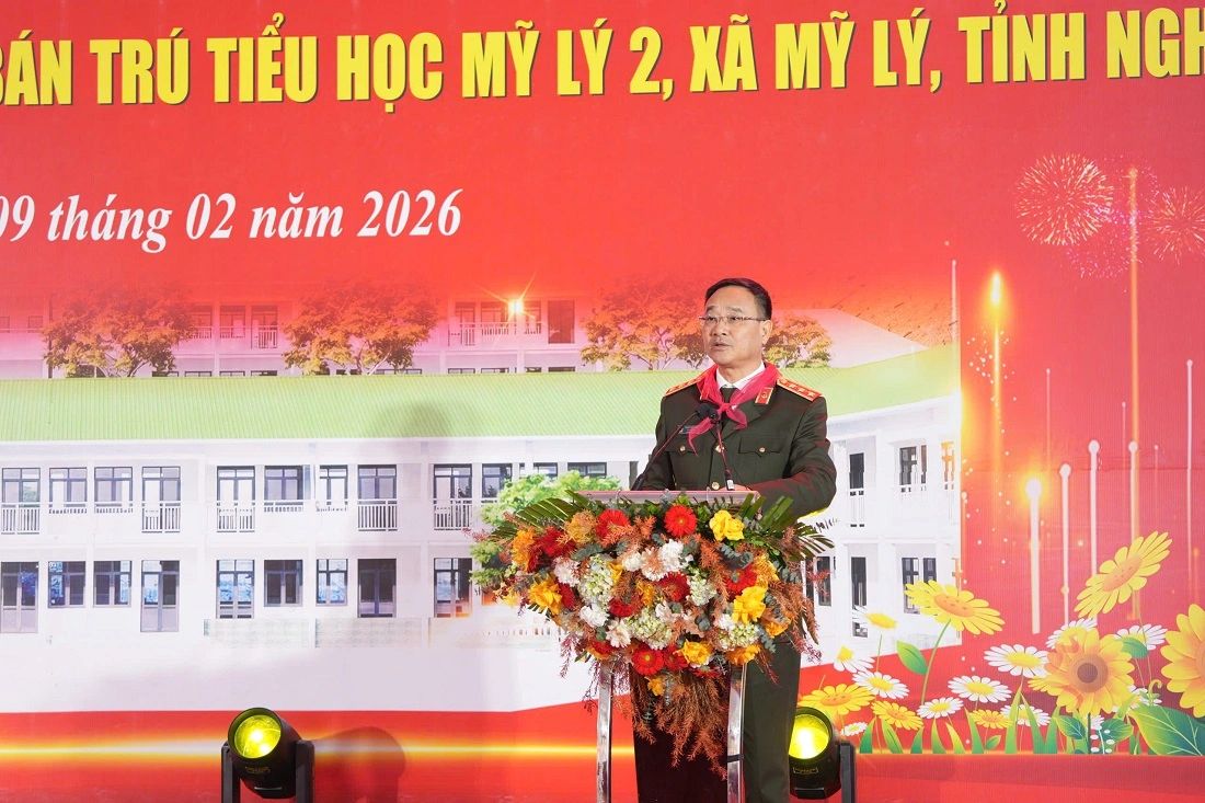 | Thượng tướng Phạm Thế Tùng, Ủy viên Ban Chấp hành Trung ương Đảng, Ủy viên Ban Thường vụ Đảng ủy Công an Trung ương, Thứ trưởng Bộ Công an, Phó Chủ tịch thường trực Hiệp hội An ninh mạng quốc gia phát biểu tại buổi lễ Khánh thành Trường Phổ thông dân tốc bán trú tiểu học Mỹ Lý 2, tỉnh Nghệ An. |
