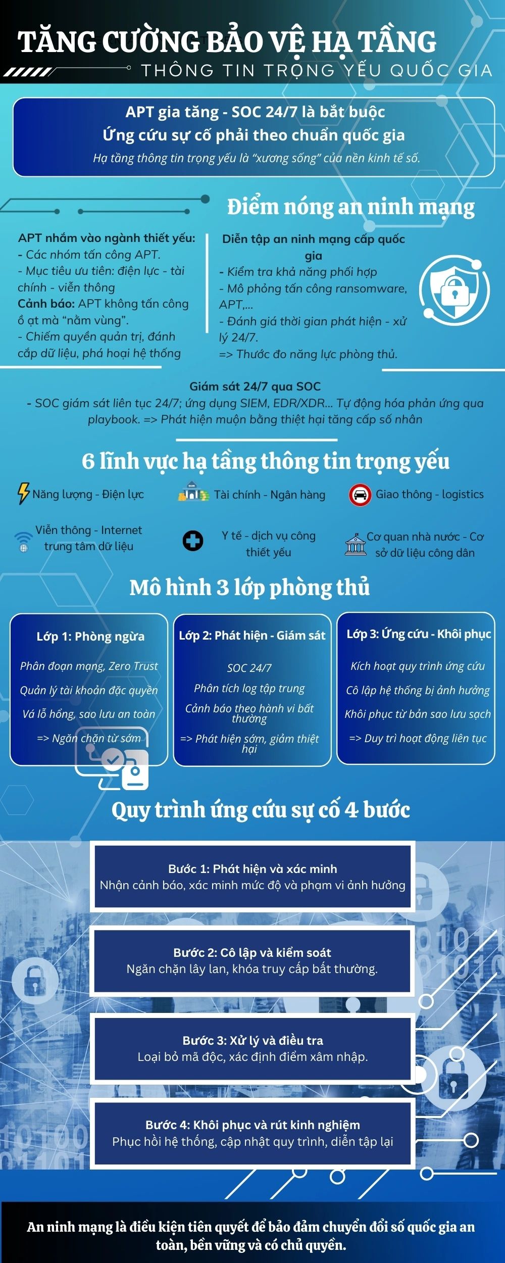 Hạ tầng thông tin trọng yếu quốc gia đang trở thành mục tiêu ưu tiên của các nhóm tấn công có chủ đích. Trong bối cảnh chuyển đổi số diễn ra mạnh mẽ, các hệ thống điện lực, tài chính, viễn thông, giao thông, y tế và cơ sở dữ liệu công dân không chỉ là nền tảng vận hành kinh tế - xã hội mà còn là “xương sống” bảo đảm chủ quyền số quốc gia.