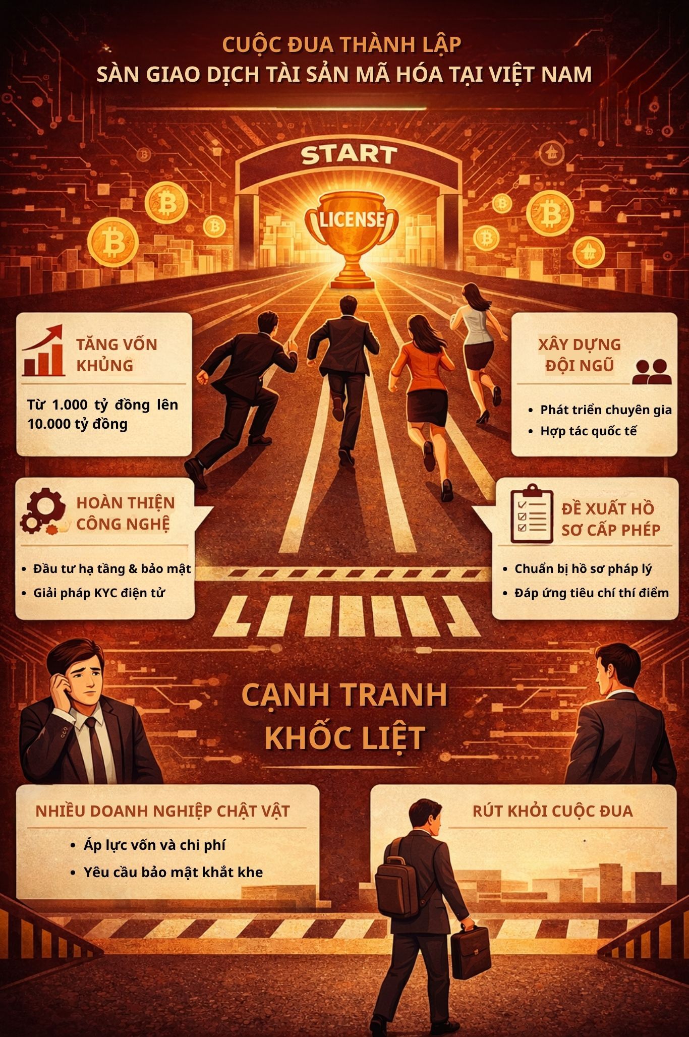 Có thể thấy, cuộc đua thành lập sàn giao dịch tài sản mã hóa tại Việt Nam đang tăng nhiệt rõ rệt. Trước khi danh sách các hồ sơ đề nghị cấp phép cung cấp dịch vụ tổ chức thị trường giao dịch tài sản mã hóa được Bộ Tài chính công bố, để chuẩn bị cho cuộc đua hết sức cam go và vượt qua những yêu cầu pháp lý khắt khe, các doanh nghiệp lớn đều đồng loạt đẩy nhanh quá trình chuẩn bị, từ tăng vốn, hoàn thiện hạ tầng công nghệ đến xây dựng đội ngũ vận hành, nhằm đáp ứng các tiêu chí thí điểm.