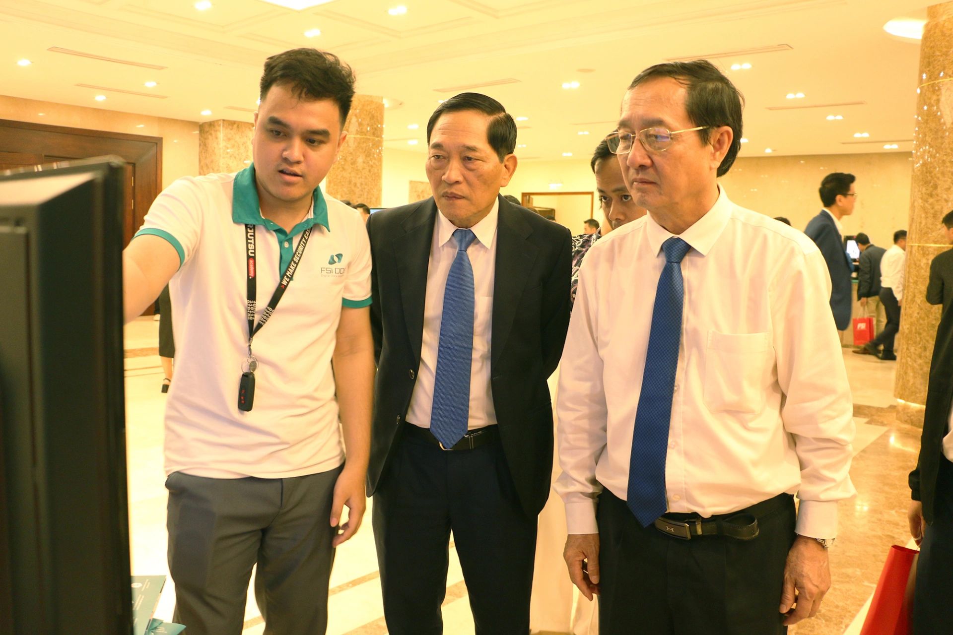 | Ông Huỳnh Thành Đạt - Phó Trưởng ban Dân vận và Tuyên giáo Trung ương và ông Trần Văn Tùng - Chủ tịch Hội Thông tin Khoa học và Công nghệ tham quan gian triển lãm của doanh nghiệp an toàn thông tin |