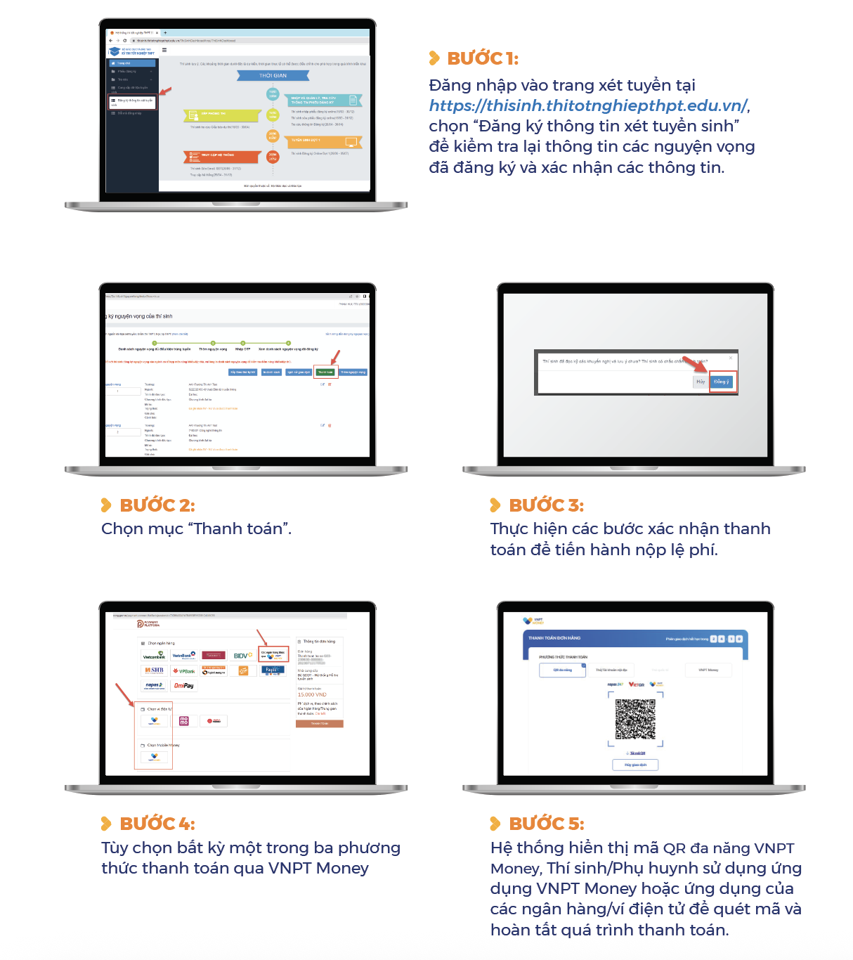 VNPT Money cung cấp nền tảng thanh toán trực tuyến hiện đại, tích hợp sẵn mã QR đa năng cho phép người dùng thực hiện giao dịch thanh toán chỉ sau vài bước chạm. Thí sinh có thể chọn nộp lệ phí qua ngay tại hệ thống đăng ký xét tuyển https://thisinh.thitotnghiepthpt.edu.vn hoặc trên ứng dụng VNPT Money.