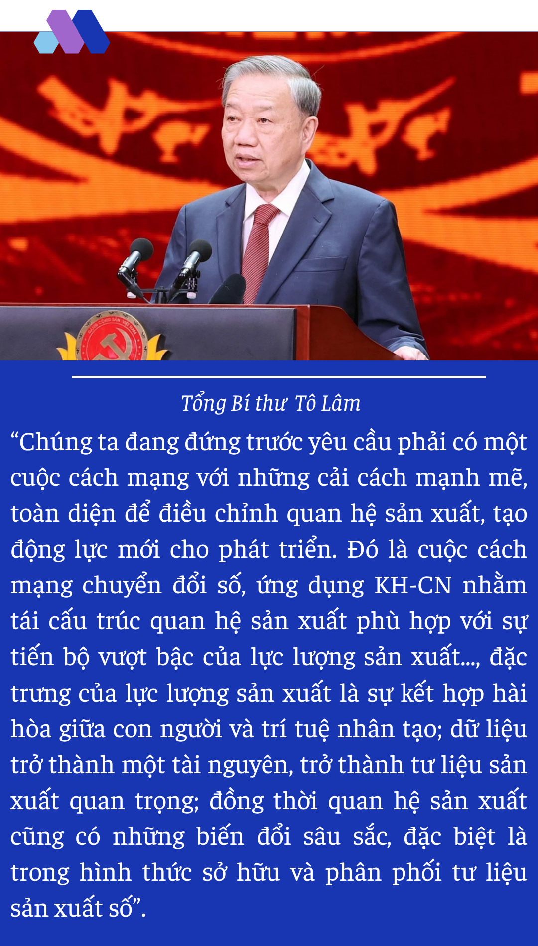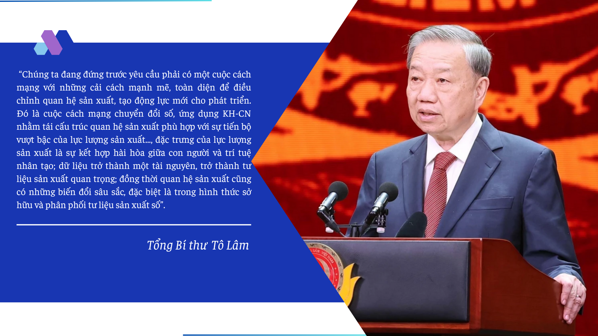 Trong Văn kiện Đại hội XIV của Tổng Bí thư Tô Lâm nhấn mạnh: “Chuyển đổi số phải được triển khai đồng bộ ở mọi lĩnh vực, từ công nghiệp đến nông nghiệp, từ thành thị đến nông thôn, trong đó dữ liệu và công nghệ trở thành trở thành động lực để tái cấu trúc phương thức sản xuất, nâng cao năng suất lao động, tăng giá trị cho sản phẩm Việt Nam”.