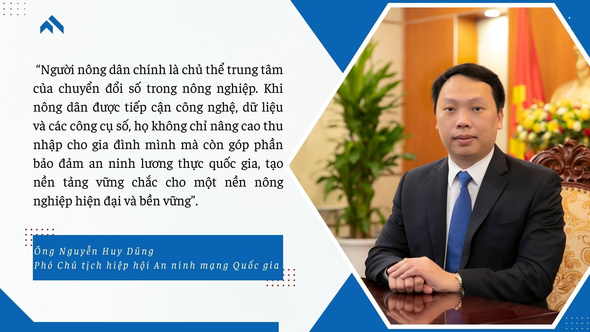 Từ những định hướng mang tính chiến lược này, Ông Nguyễn Huy Dũng - Phó Chủ tịch Hiệp hội An ninh mạng Quốc gia, Ủy viên Ban Chỉ đạo Trung ương về khoa học, công nghệ – đã nhấn mạnh rằng chuyển đổi số trong nông nghiệp, nông thôn và cho người nông dân không chỉ đơn thuần là ứng dụng công nghệ vào khâu sản xuất, mà là sự tái cấu trúc toàn bộ chuỗi giá trị nông nghiệp.