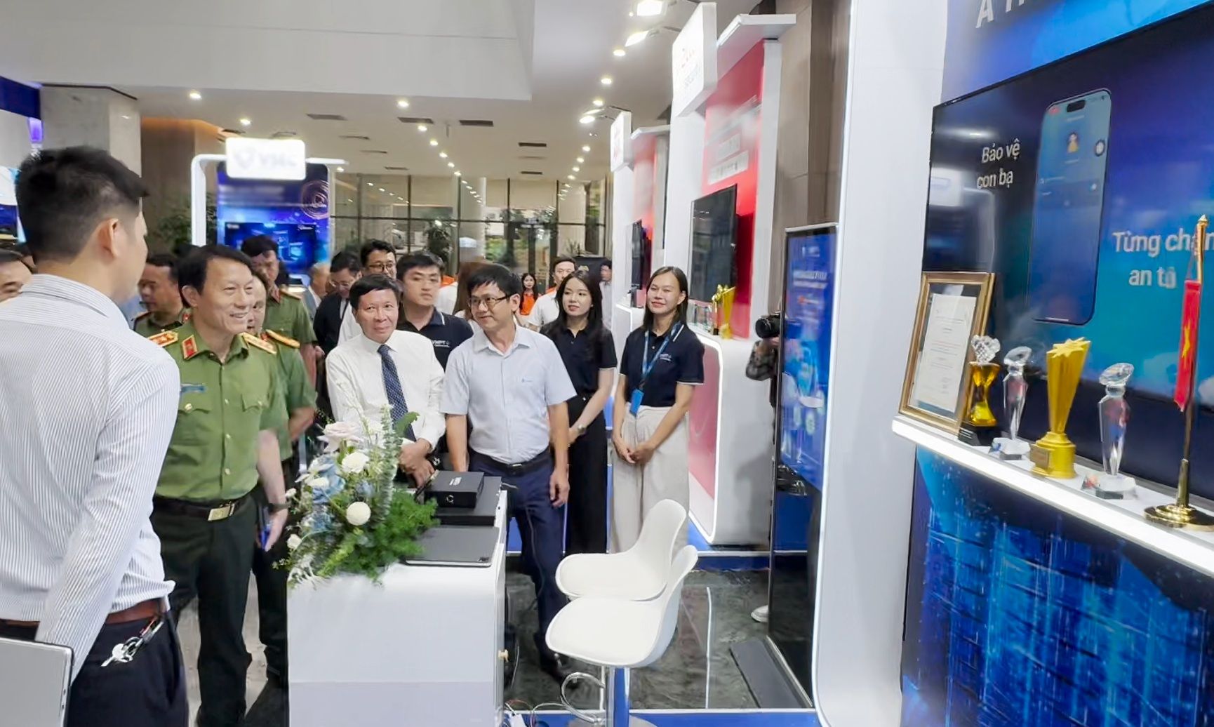 | Đại tướng Lương Tam Quang - Bộ Trưởng Bộ Công an tham quan gian hàng của VNPT Cyber Immunity |
