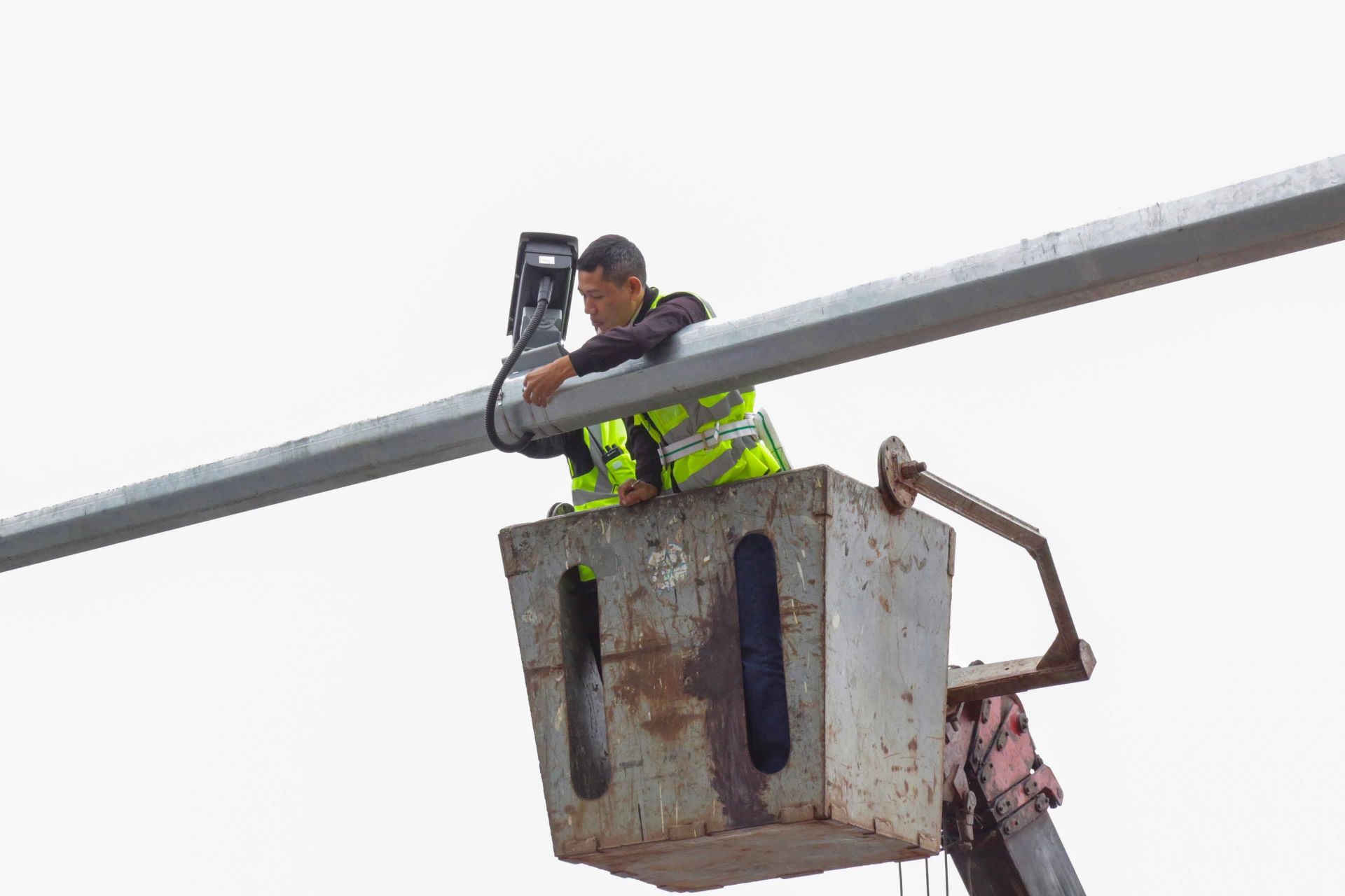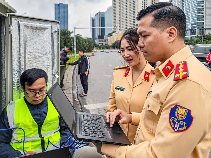 | Cảnh sát giao thông phối hợp cùng đội ngũ kỹ sư bảo đảm các yêu cầu kỹ thuật trong việc lắp đặt camera AI |