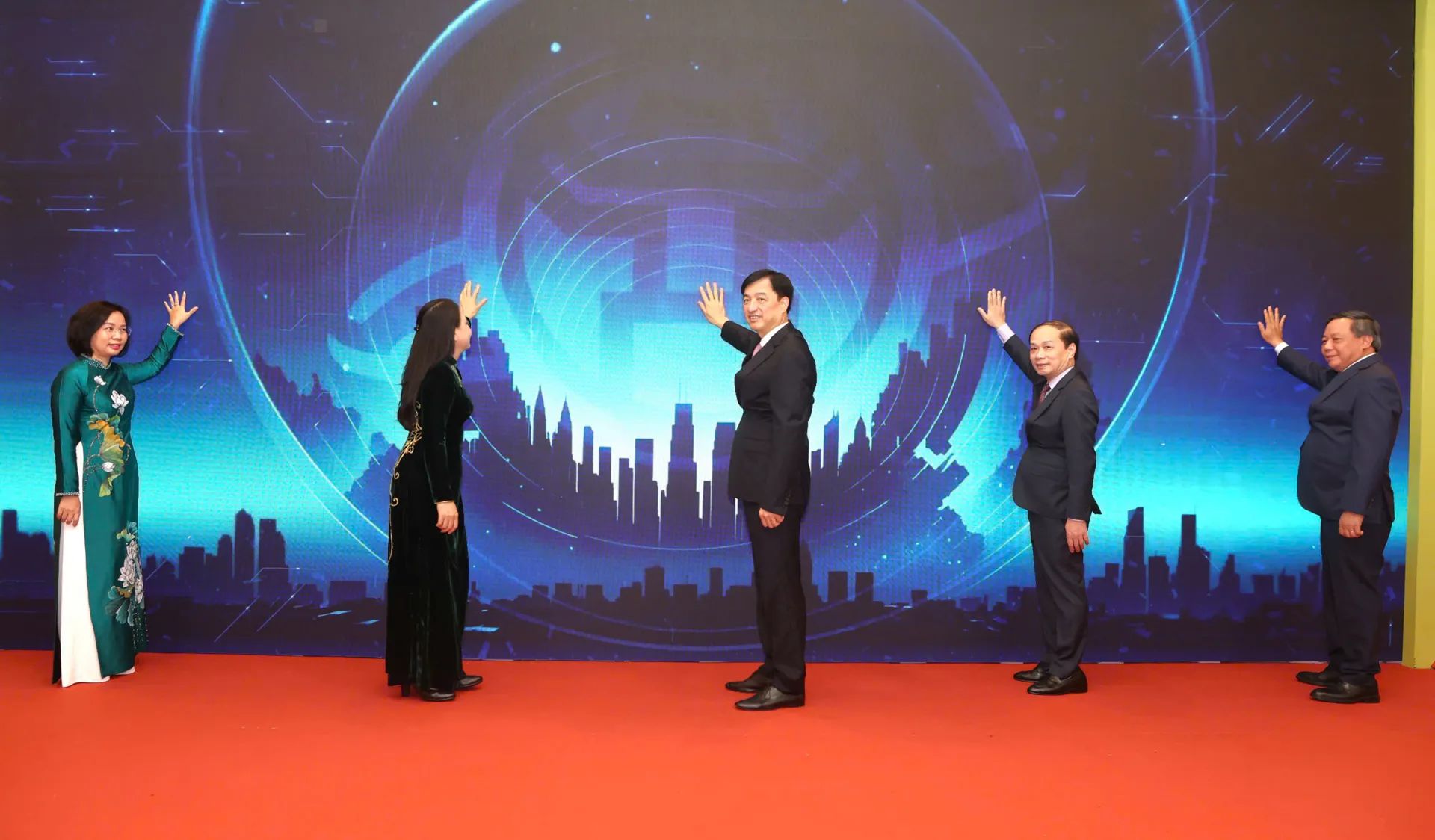 | Các đại biểu nhấn nút cập nhật phần mềm “Mặt trận số” trên app iHanoi. |